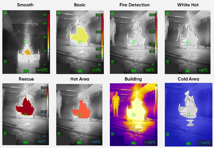 Basic, Smooth, White Hot, Black Hot, Fire Detection, Rescue, Hot Area, Cold Area, Rainbow, Blending |