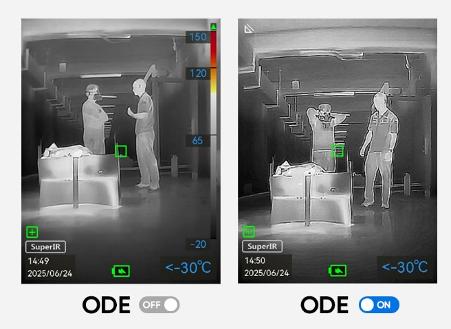 Auto AGC funkcija palielina kontrastu fona zonās, padarot redzamas smalkas detaļas. ODE uzlabo skaidrību, nemainot termiskos datus. FP sērija atbilst IP67 standartam — tā ir pilnībā putekļiem necaurlaidīga un ūdensizturīga līdz 1 metra dziļumā 30 minūtes. Tā ir sertificēta darbībai ekstremālos karstuma apstākļos.