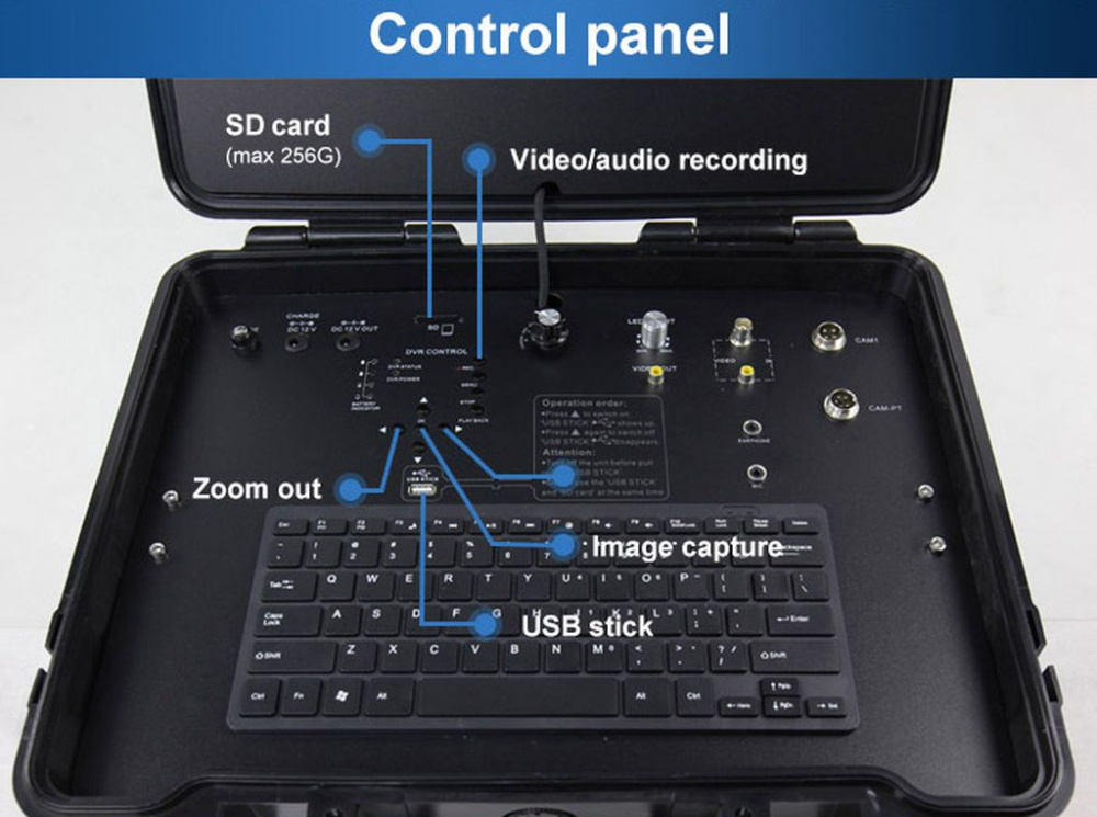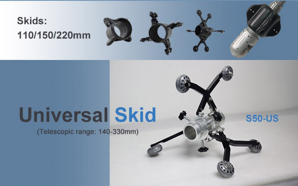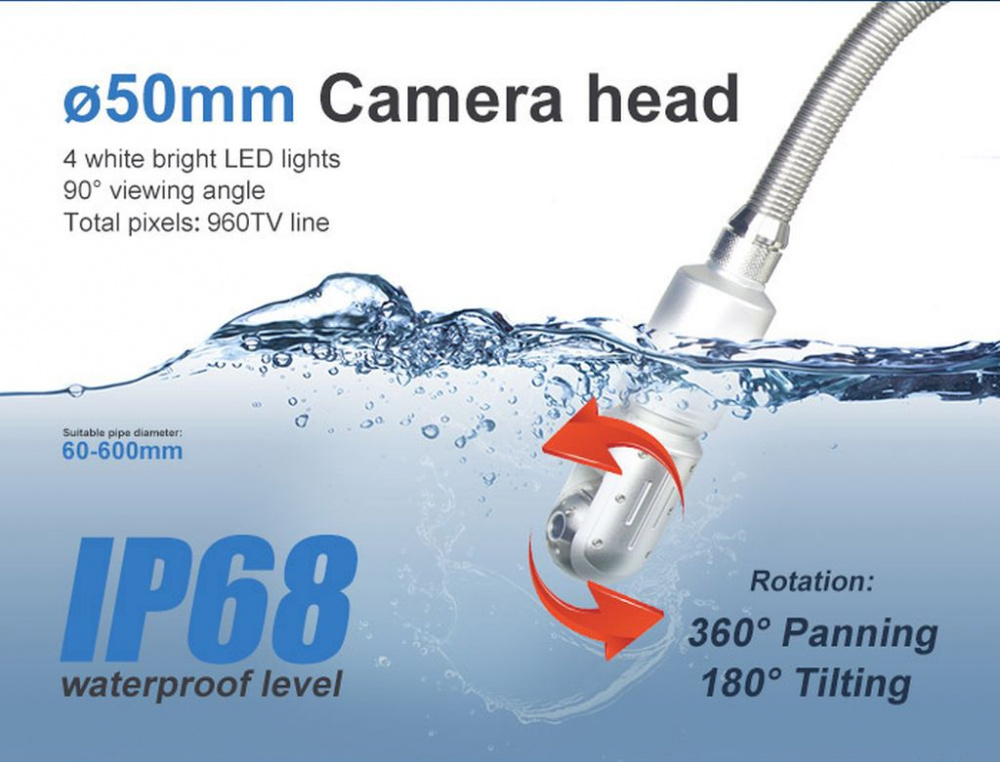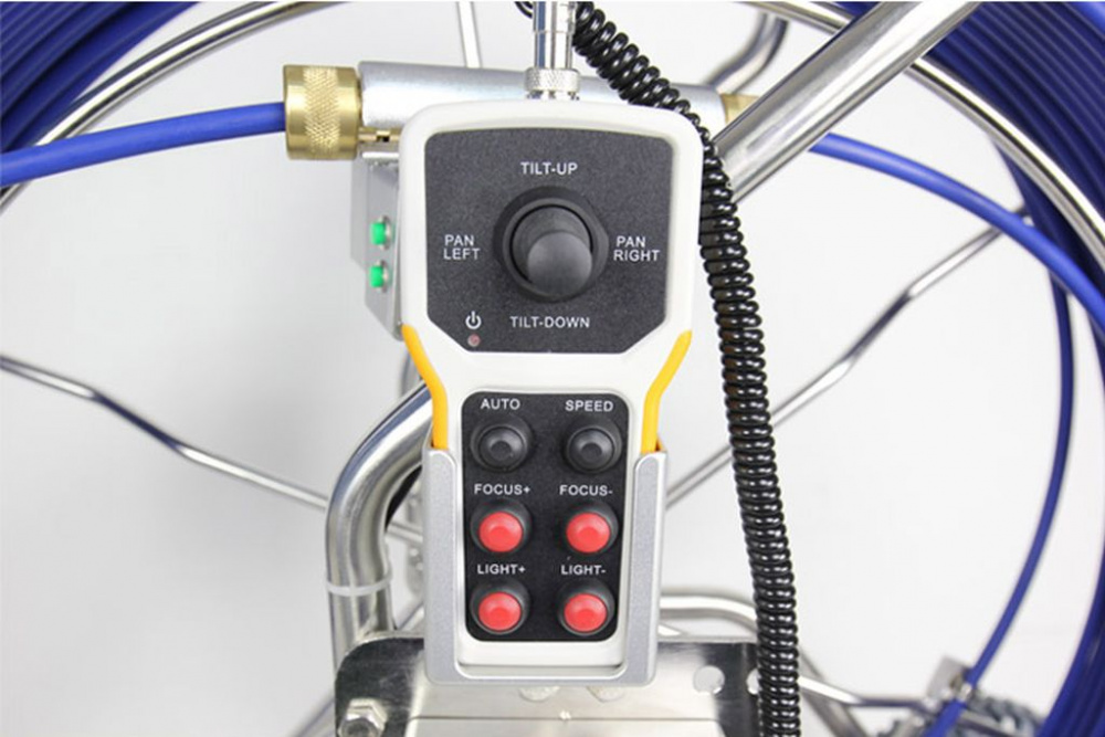 WOPSON WPS-B5-C50PT - cauruļvadu video pārbaudes sistēma ar divās plaknēs rotējošu 50 mm kameru, 9" vai 15" kontroles displeju, kameras galvā iebūvētu 512 Hz indukcijas raidītāju un 60 m vai 120 m stumšanas kabeli.
